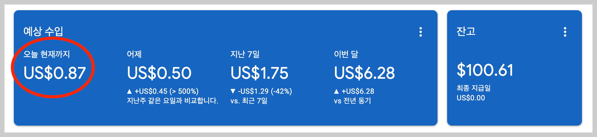 애드센스 광고 수익은 구글 애드센스 사이트에서 실시간으로 확인할 수 있습니다. 오늘 현재 포스팅을 하는 날에는 0.87USD를 벌어드렸고 수익 창출한 이후부터 지금까지 벌어온 수익은 100달러를 넘겼습니다! 100달러 채우는데 제 기준에서는 7개월 정도 걸렸던 거 같아요. 블로그 수익 창출에 대해 광고하는 대부분은 '블로그로 한 달에 100만 원 벌기' 등등으로 유혹을 하는데 블로그로 100만원 이상을 벌려면 적어도 1년 이상은 꾸준히 블로그를 운영하고 시간을 쏟아야만 가능하더라고요. 물론 개인차는 있겠지만요🤨