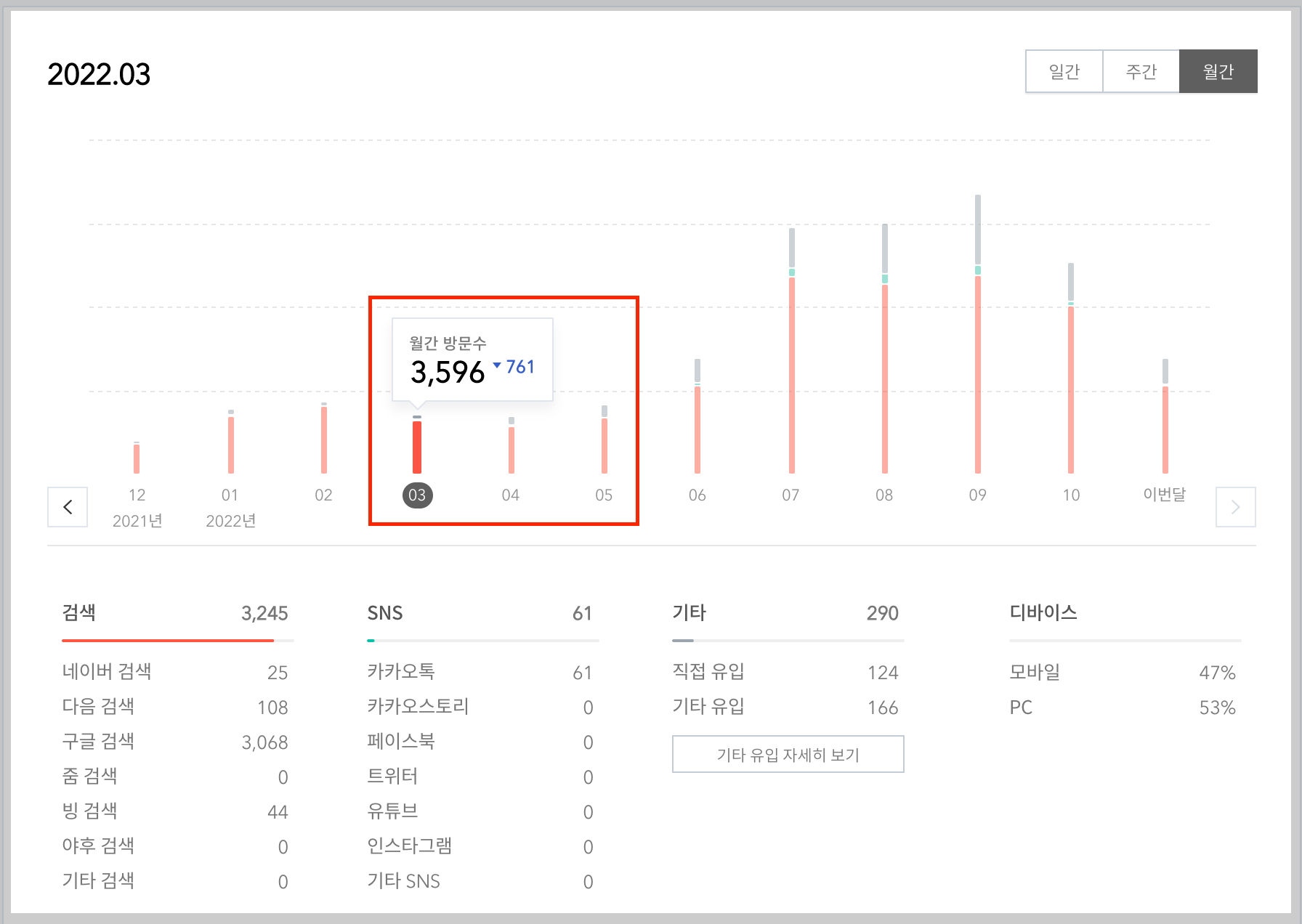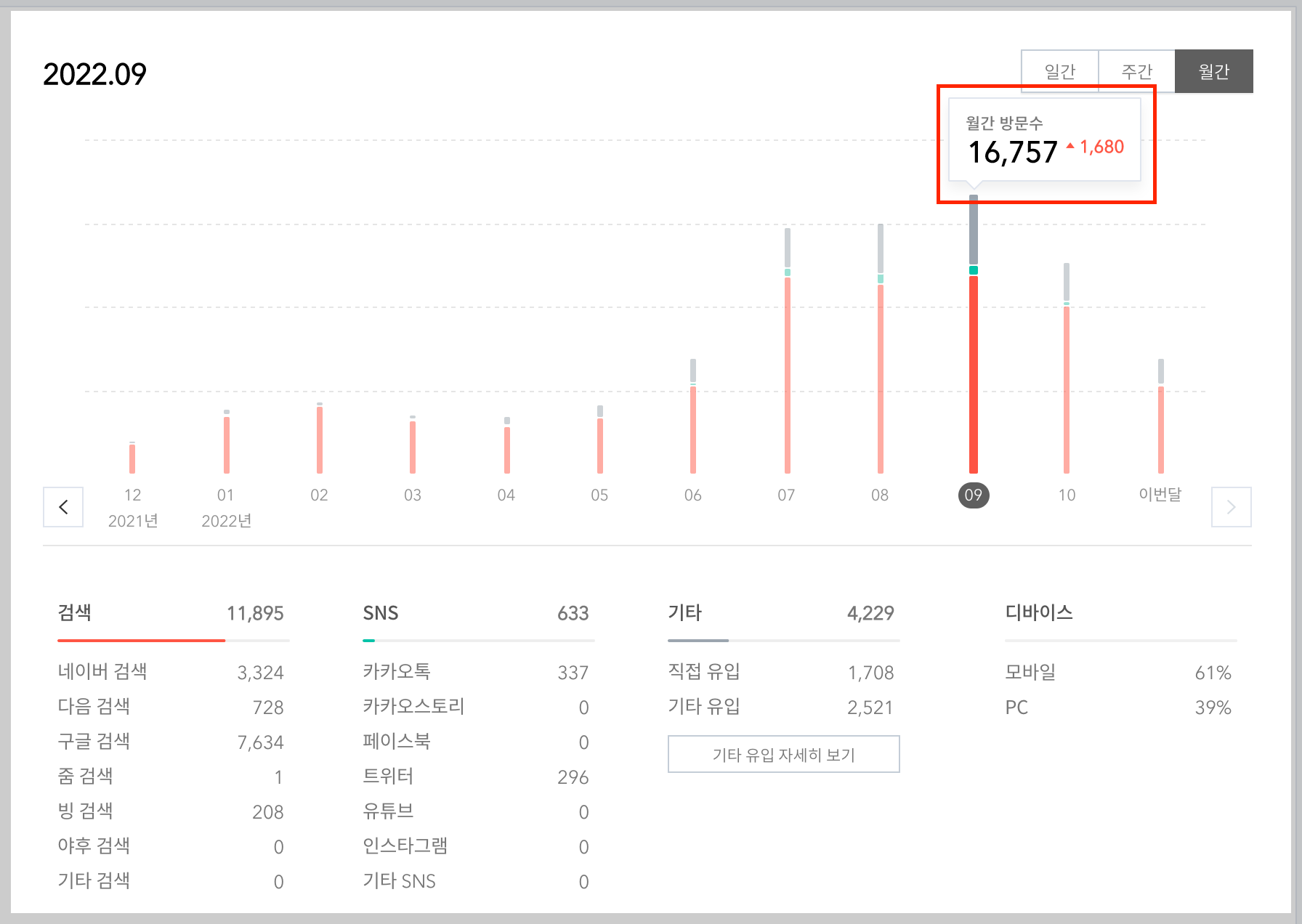 마음을 다시 잡고 '게임'에 대한 포스팅을 하기 시작했고 그로 인해 방문자는 점점 증가하게 됐습니다. 2022년 9월이 되어서야 가장 많은 방문자 수를 달성하게 되었고 일일 방문자 중에 가장 많았던 날이 하루에 800명이 들어왔던 걸로 기억하고 있어요. 그래도 하루에 100명씩 들어오던 때보다 7~8배는 더 늘게 된 거죠. 이로써 티스토리 방문자에 대해 알게 된 점은 '그냥 계속 글을 올리면 방문자는 알아서 늘겠다'라는 겁니다. 글에 정보성이나 퀄리티는 사실 크게 중요하지 않고 최소한에 글자 수를 채운다면 방문자는 늘게 되어있더라고요.