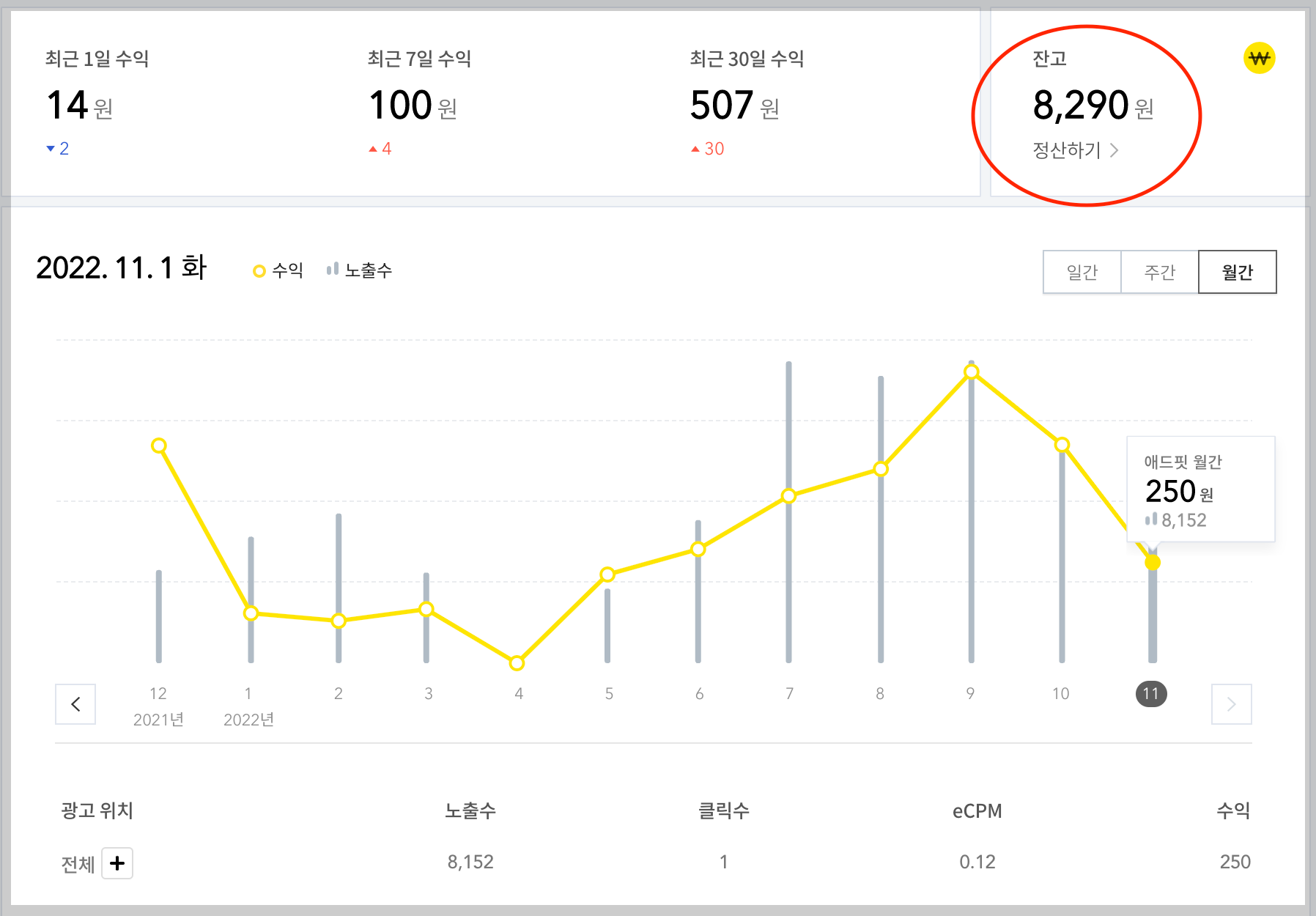 애드센스와 마찬가지로 카카오 애드핏으로도 수익은 낼 수 있는데 수익이 거의 미미하다고 보시면 됩니다. 티스토리 개설 이후 지금까지 벌어온 수익이 애드센스에 비하면 현저히 낮은 걸 볼 수 있죠? 그래서 전 없는 셈 치고 있고 포스팅을 할 때 애드핏 광고는 글 상단에만 두고 쓰지 않고 있습니다.