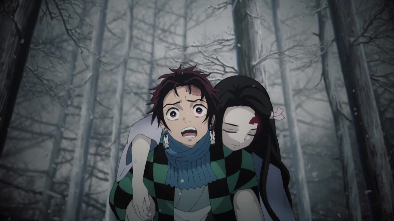다행히 숨이 붙어있는 동생 네즈코를 업고 마을로 뛰어갑니다.