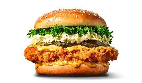 ▶설명 - "아삭한 식감이 살아있는 달콤한 코울슬로와 바삭하게 튀긴 통가슴살 치킨 패티가 어우러진 버거"